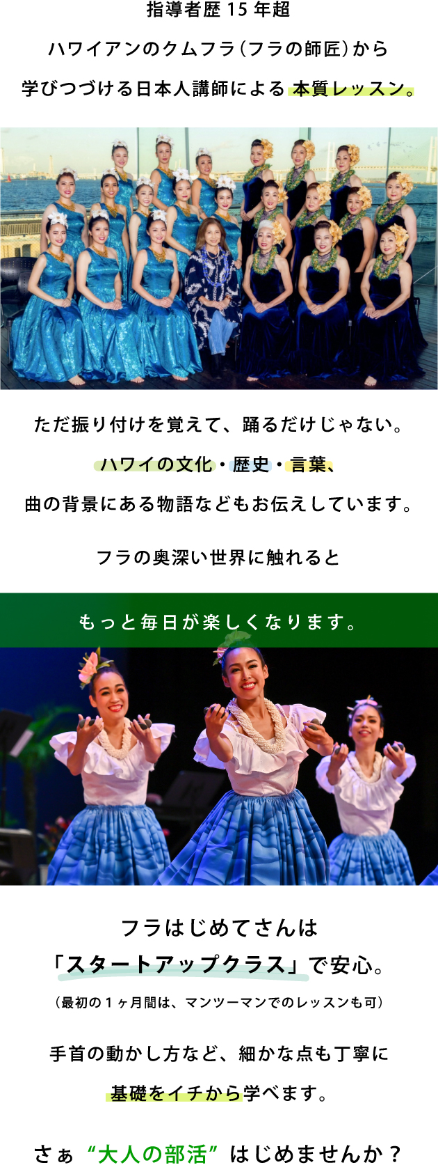 ※フラがはじめての方は「スタートアップクラス(土曜)」でのスタートがおすすめです